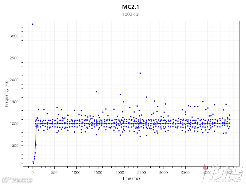 MouseTester的测试结果表明这鼠标跟其他采用PMW3325的型号没任何区别,以1000dpi为例xy离散较少,回报率集中在900Hz到1100Hz之间,极少偏离,比较稳定。