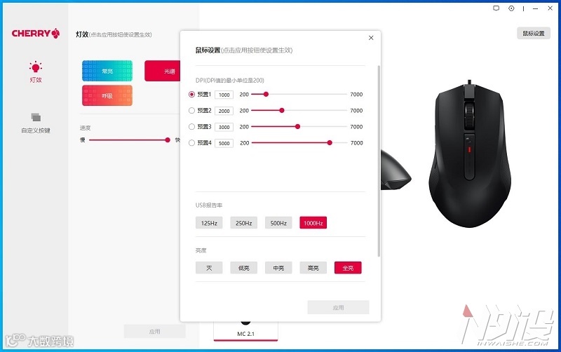 鼠标设置中,有对应的性能参数和RGB亮度选项,DPI步进以200为一个档位,从最低的200到7000DPI可调。