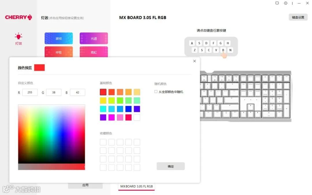 长按5秒小樱桃键便可打开驱动下载页面,相当实用便捷,而在调节驱动时需要先将线材连好,否则无法正常调节。键盘的驱动页面简洁、易上手,在“灯效”页面中玩家可对键盘整体进行灯效调节和亮度、速度的设置,也可以对个别按键进行单独颜色的设置。