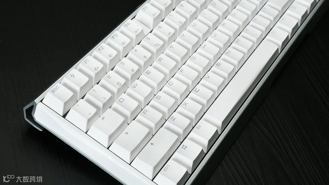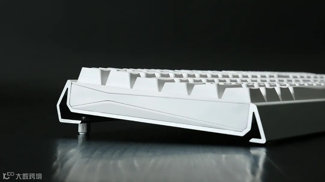 该键盘的键帽依旧为原厂高度,并采用嵌入式设计,但由于它是无钢板设计,所以从某些角度看起来又有些像悬浮式的设计风格。从侧面可以看出它的表面阶梯弧度并不大,但配合上底部可更换的小脚撑和采用人体工学设计的键帽,还是能为玩家提供舒适的敲击手感。并且侧边框的一体成型工艺看起来也十分帅气,镂空的斜面设计能很好地凸显出它的质感与观感。当然,这款键盘还配备了CHERRY手托,不过该手托需要单独购买,再配合上脚撑使用会更加舒适。