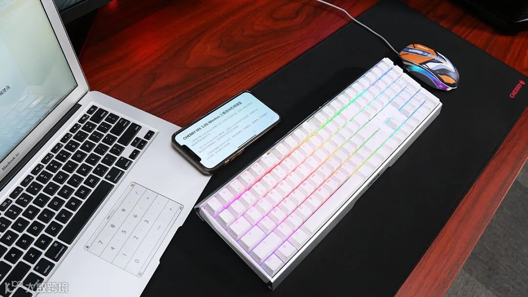 这款键盘是CHERRY的首款无线机械键盘,并采用有线、蓝牙、2.4Ghz三模连接方案,而在蓝牙模式中它采用的是蓝牙5.2技术,并支持记忆存储3款不同设备,用户通过长按 Fn+1/2/3可以进行配对,短按Fn+1/2/3可以进行设备切换,等待切换速度约为3秒。再加上有线和2.4Ghz,它共支持最多5台设备连接,对于目前主流的智能手机、平板电脑及台式机也都有着良好的兼容表现,多设备切换功能也能为用户带来更好使用体验,进一步提升办公效率。