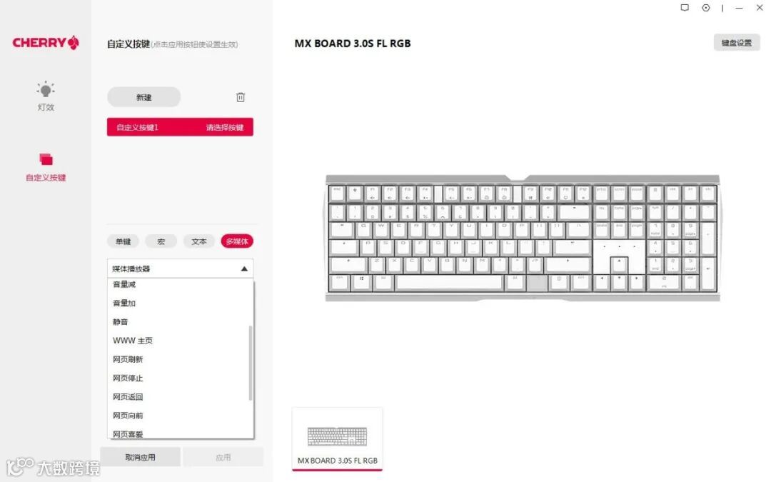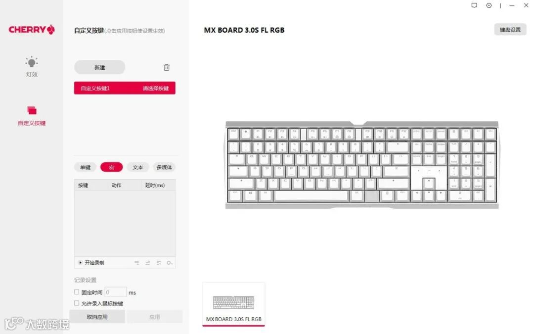 在“自定义按键”页面中,玩家可以对单独的按键进行功能设置、多媒体设置、文本设置,也可以对其绑定录制好的宏命令。