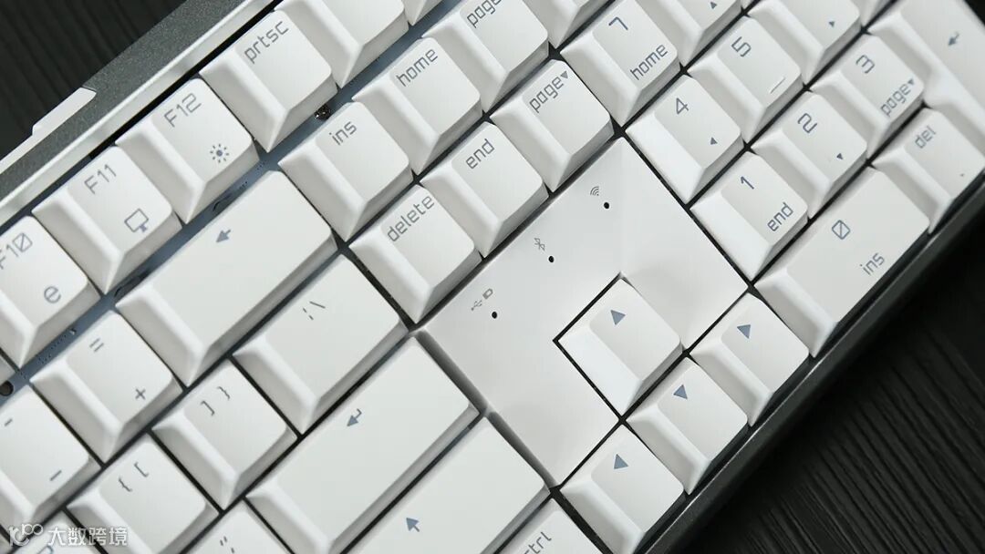 方向键上方依旧采用了折痕式造型设计,而这也是出现在MX 1.0、MX 2.0S、MX 3.0、MX 3.0S上的CHERRY独有设计。同时,由于键盘为109键设计,所以它的指示灯也被安放在了这里,不过它并不是常见的功能指示灯,而是改为充电/有线连接的指示灯、蓝牙连接指示灯、2.4Ghz无线连接指示灯,而大小写锁定键、数字键区的指示灯会在原按键上用红色背光来代替。