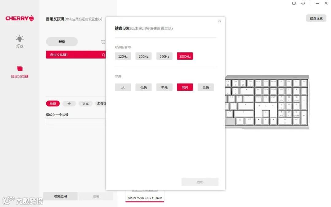 驱动右上方还有着“键盘设置”按键,玩家可以对键盘的报告率和灯光亮度进行设置。