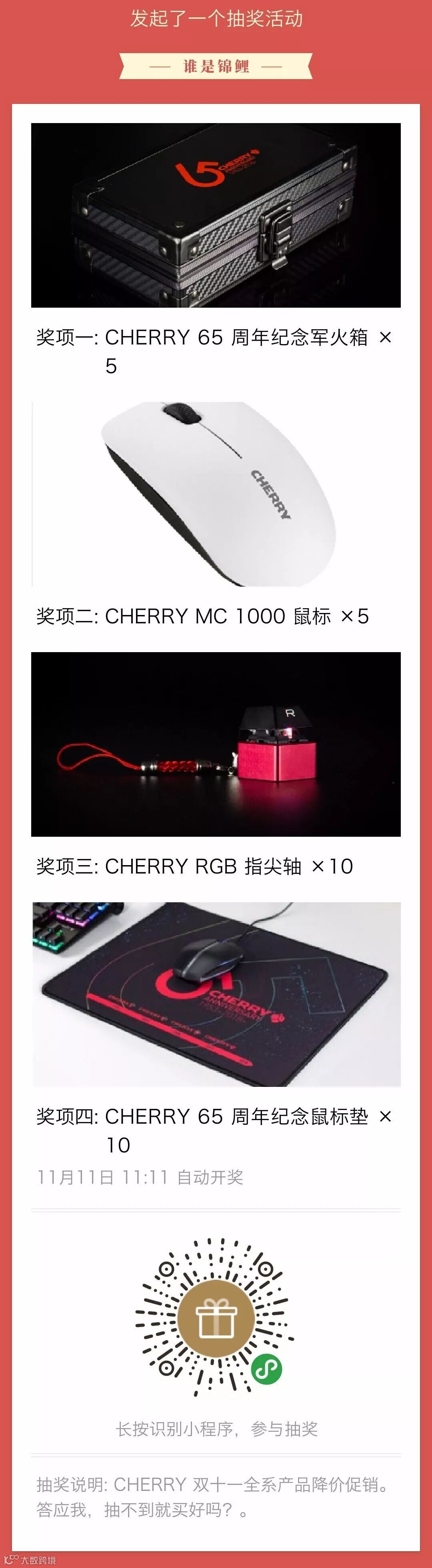 像双十一这种剁手率极高的全民狂欢购物节里,又怎么能少得了抽抽抽呢!为了弥补大家疯狂购物后的空虚,微博@CHERRY中国早就准备了十余万元奖品回馈大家!微博搜索CHERRY中国,置顶微博一定有你想要的!