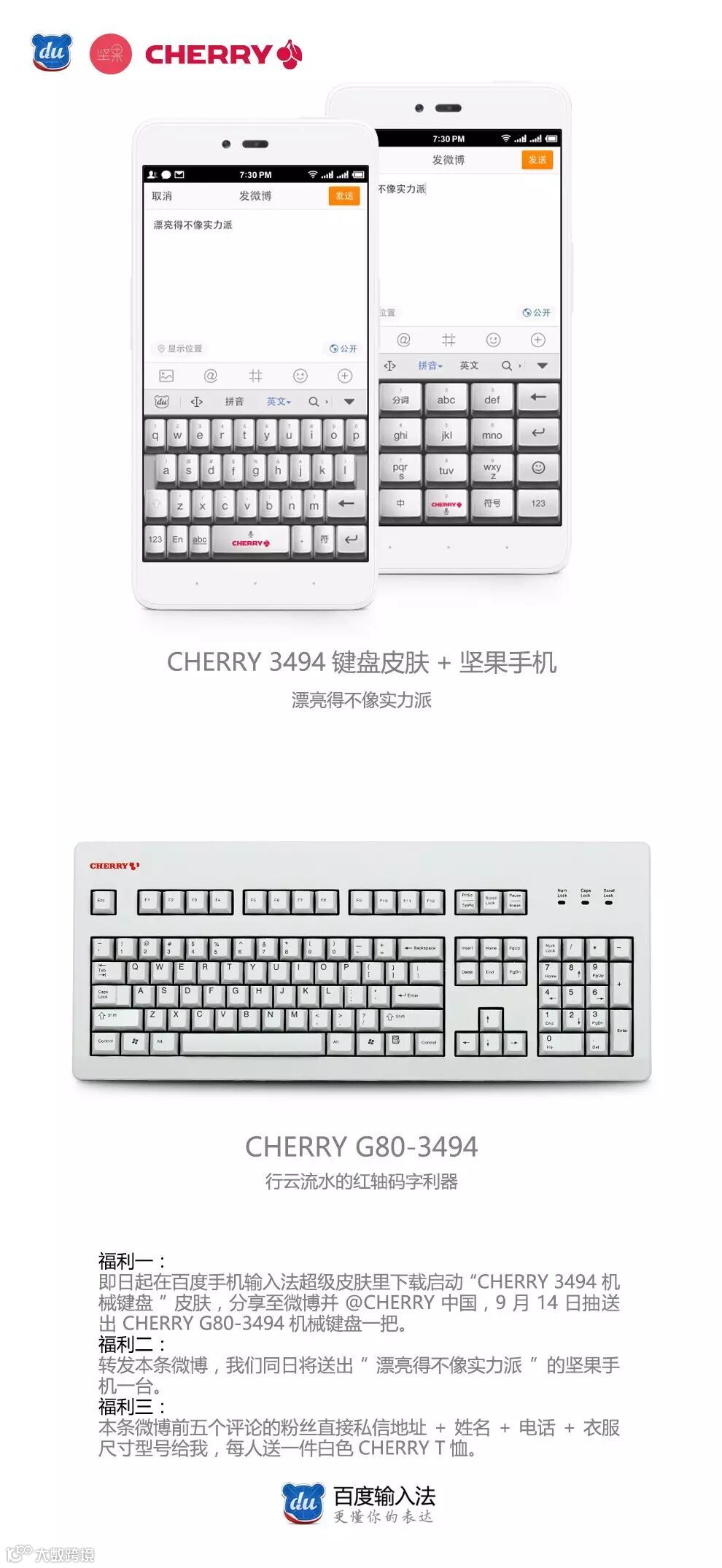 下载新版百度输入法CHERRY皮肤并分享至新浪微博@CHERRY中国,就有机会获得G80-3494键盘,