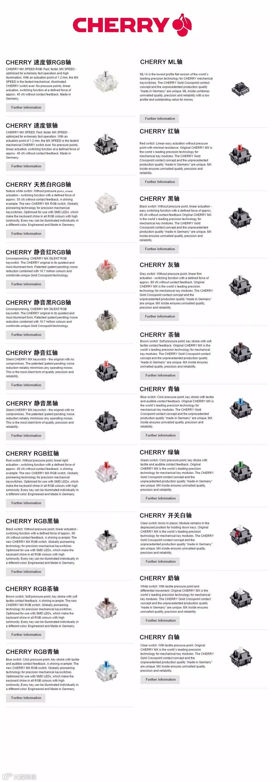 附:CHERRY当前所有轴体(内容来自德国官网)