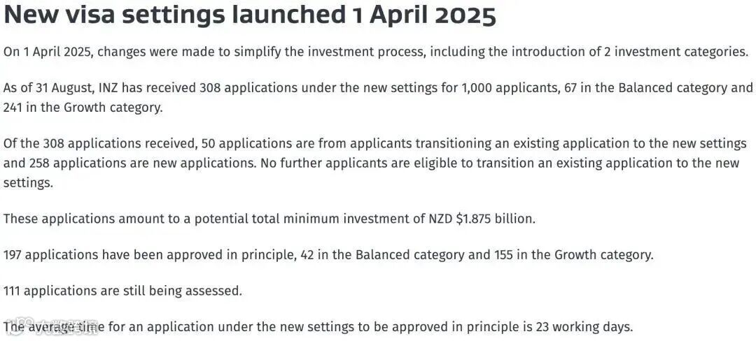 截至2025年8月31日,新西兰移民局收到308份申请,其中增长类别241份,平衡类别67份,共1000名申请人。