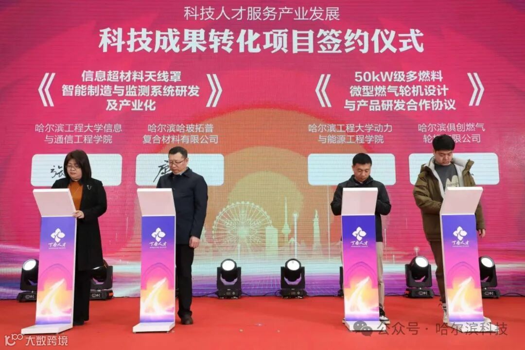 启动仪式现场,哈尔滨市科学技术局组织哈尔滨工程大学、黑龙江大学、省农科院等校所科研团队与哈尔滨市企业开展成果对接,促成“50kW级多燃料微型燃气轮机设计与产品研发”等12个项目现场签约。同时,现场集中展示校企成果转化项目50项,这些项目围绕科技赋能亚冬会、高端装备、新材料、电子信息、农副产品深加工等领域,不仅具有广阔的市场前景,也符合哈市产业发展方向,为冰城经济社会发展注入了新的动力。