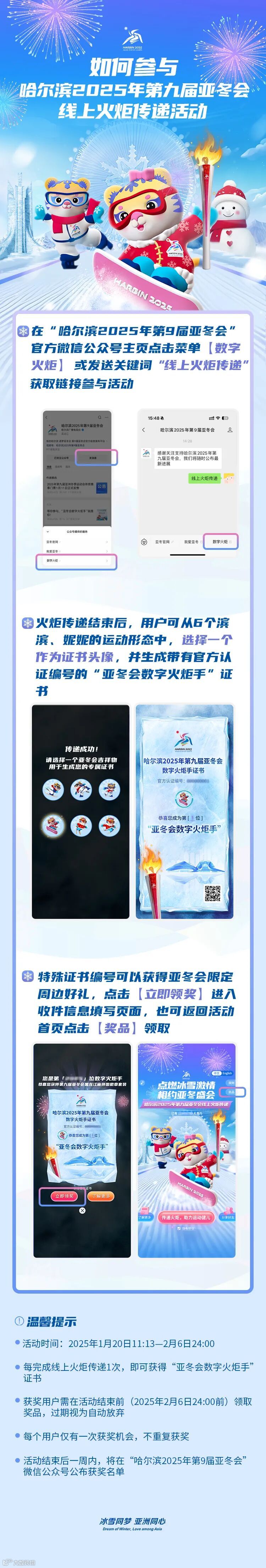全球网民可在“哈尔滨2025年第9届亚冬会”官方微信公众号主页点击菜单“数字火炬”,或发送关键词“线上火炬传递”点击链接参与活动,成为 “亚冬会数字火炬手”,并拥有专属证书,特殊证书编号可赢取亚冬会限定周边好礼。