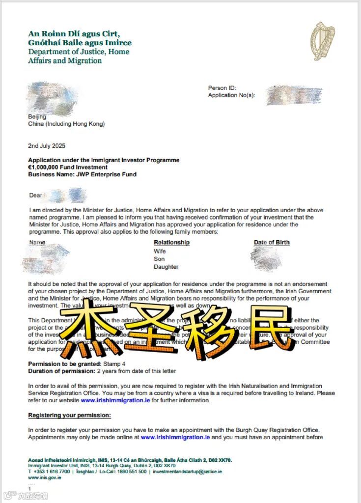 捐款完成后,申请人将获得爱尔兰的居留许可。