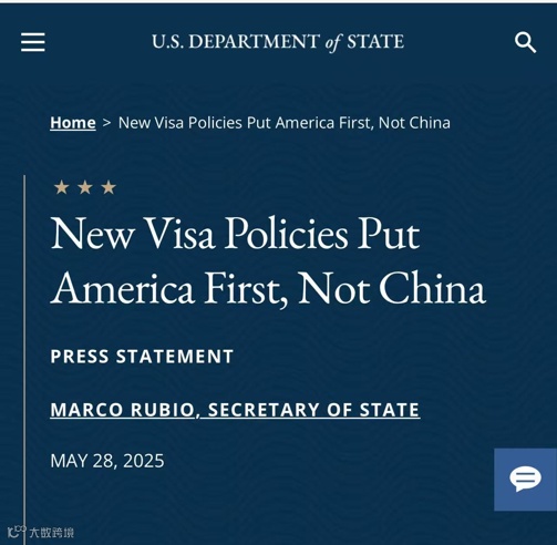 同日,美国国务院网站发布题为“新签证政策优先考虑美国,而非中国”的声明。