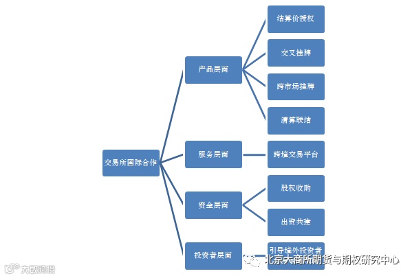 只有在市场经济国家,当大宗商品价格由市场竞争形成,而不是行政定价或者是买方、卖方垄断定价时,期货交易所才有建成定价中心的可能。国内期货交易所加深与国外交易所合作,提升国际化程度,是建设国际定价中心的有效途径。总结国际经验,期货交易所开展国际合作的形式多样(图1),引导境外投资者参与国内期货交易是国内研究较多的方式,除此之外,与境外交易所开展产品、服务和资金等多方面的合作,对于建设定价中心也有着重要价值。