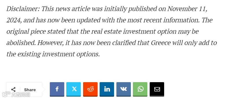 “ 免责声明:本文最初发表于2024年11月11日,现已更新为最新信息。原文指出,房地产投资选项可能会被废除。然而,现在已经澄清,希腊只将会在现有的投资选项上再增加新选项而已。” |