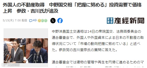 其中部分议员指出,东京都心的新建住宅中,有2-4成是由外国人购入的,且比去年激增近40%。如此,外国投资者的大量涌入推高了日本国内的房价,使得普通日本民众购房难度增加。