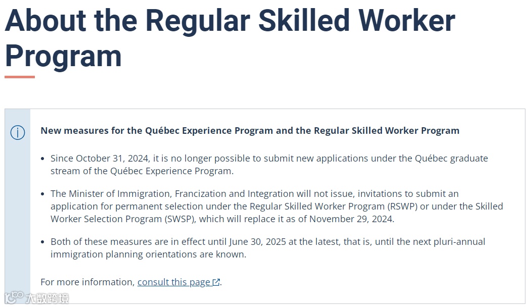 临时措施一: ■ 暂停接收魁北克经验项目下的“魁北克毕业生”通道的申请 临时措施二: ■ 暂停根据常规技术工人计划(RSWP)和技术工人选择计划(SWSP)提交永居选择申请(CSQ)的邀请发放,这两个通道项目将在2024年11月29日被替换。 这两项措施将至少实施到2025年6月30日,或者直到下一版的多年度移民规划的方向确定为止 |