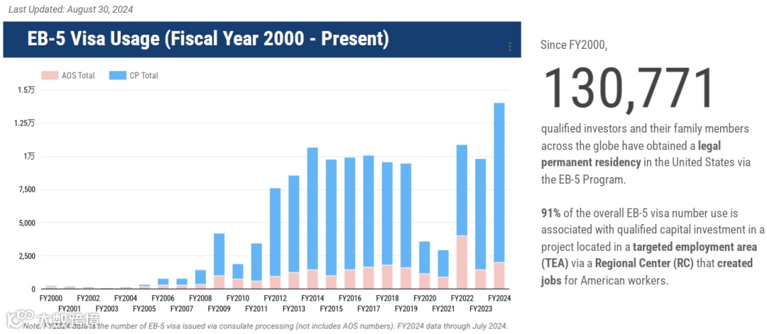 从上表中可以看出,自2000财年到2024年的7月份,公共发放了130771张EB-5类的签证,其中91%的EB-5签证是源自高失业率区域的区域中心项目。自2022财年EB-5新政实施后,EB-5签证批发量屡屡突破往年EB-5发放量,直到今年达到了一个历史新高!