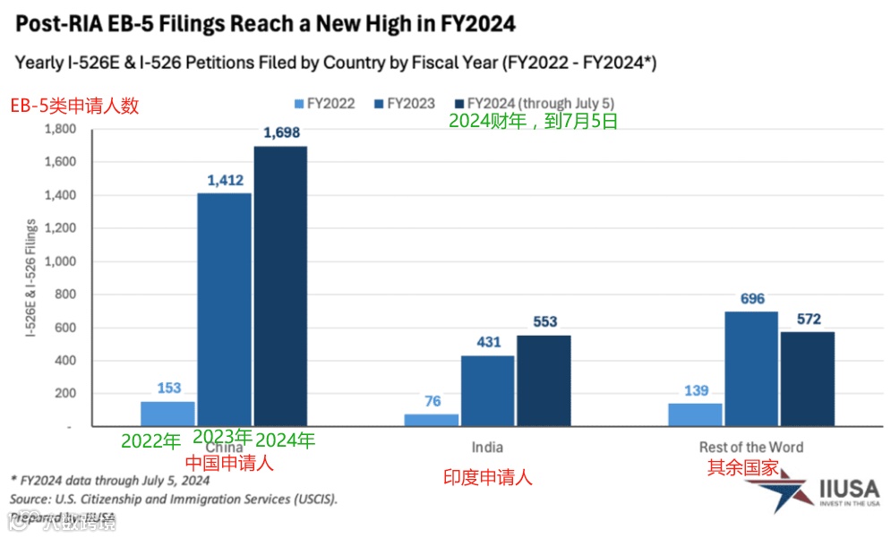 根据“美国投资协会”(IIUSA)的报告数据,在2024财年里,美国投资移民递件量达到创纪录的3300件,为美国带来26亿美元的海外投资。这其中,来自中国的申请人占了1698 件,超过同期全球申请总数的50%,稳居第一位。不但在2024财年里,根据FOIA的数据,从2021年10月到2024年7月,中国申请人依然占I-526E申请的50%以上,使其成为EB-5领域的主导者。印度的EB-5类申请数则远少于中国,排在中国之后,名列第二位。