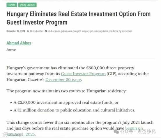 备受瞩目的匈牙利特殊贡献永居项目,按照匈牙利政府的要求,于2024年末正式关停。