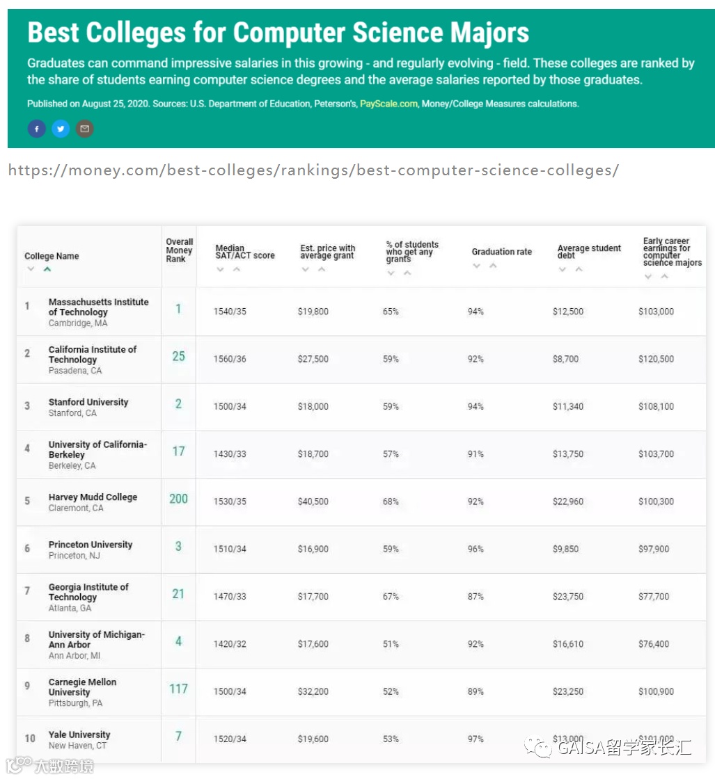 除了总榜单,《Money》还给出商科、工程和计算机科学三大热门专业领域的最具性价比大学Top 10。