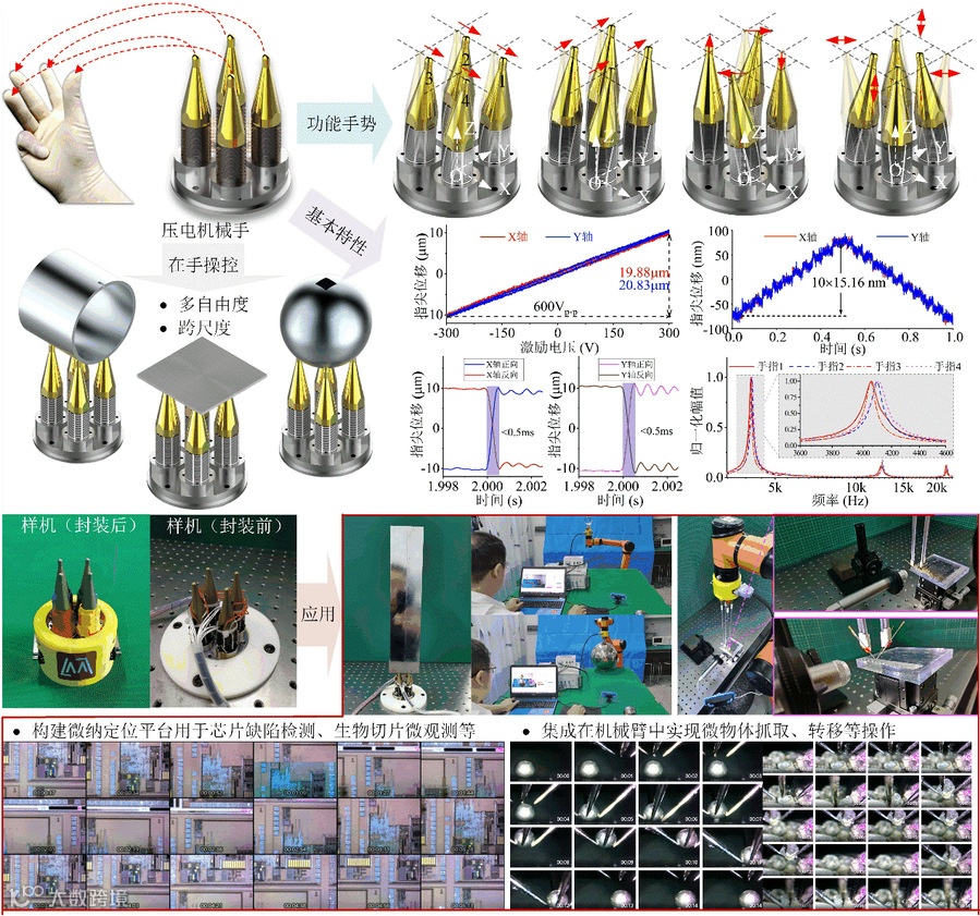 压电机械手的结构、手势、特性、样机与应用示意图