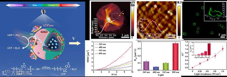 研究团队发现,含ATP合酶马达的色素团囊泡在聚电解质微胶囊表面的融合过程遵循“降落伞”机制,可实现ATP合酶马达内外取向的调控,获得超分子胶体马达的非对称结构。结合实验数据的物理分析和理论模拟,在ADP、无机磷的反应溶液中,光照下超分子胶体马达的表面发生不对称的光合磷酸化反应,驱动超分子胶体马达运动,展示出较高的能量转化与驱动效率。通过改变光强,可实现多个生物分子马达协同作用并放大这些分子力与运动,调控超分子胶体马达的运动行为,模拟生命体从分子到介观到宏观逐级放大做功的现象。
