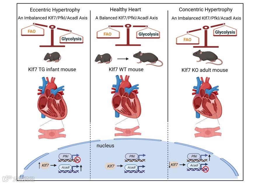 在心肌肥厚和心力衰竭阶段,糖脂代谢底物的转换是一种代偿性现象还是重要致病因素,几十年来一直存在争议,本研究证实糖脂代谢底物的转换是引发心肌肥厚的独立因素。研究发现,Klf7心肌特异性敲除(KO)小鼠和Klf7心肌特异性过表达(TG)小鼠分别干扰成年和幼年时期心脏的糖脂代谢平衡,导致其心脏收缩功能障碍和心肌纤维化产生。因此,KO和TG小鼠均可作为自发性心肌肥厚模型,为研究幼年到成年阶段代谢疾病的病理进展提供基础。最终,团队通过体内和体外实验,证明心肌特异性敲低磷酸果糖激酶(Pfkl)和过表达长链酰基辅酶A脱氢酶(Acadl)分别通过抑制糖酵解和增强脂肪酸氧化来部分缓解KO小鼠的心肌肥厚病理表型。