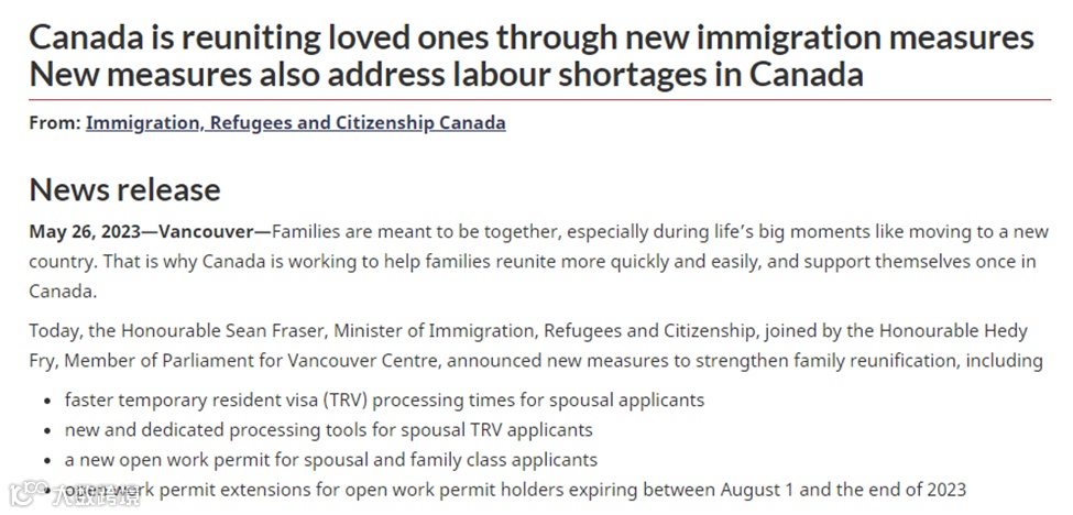 除了团聚移民政策,移民部长还宣布了另一项新举措——加拿大政府将向配偶申请人及其受抚养子女发放“开放式工作许可”!