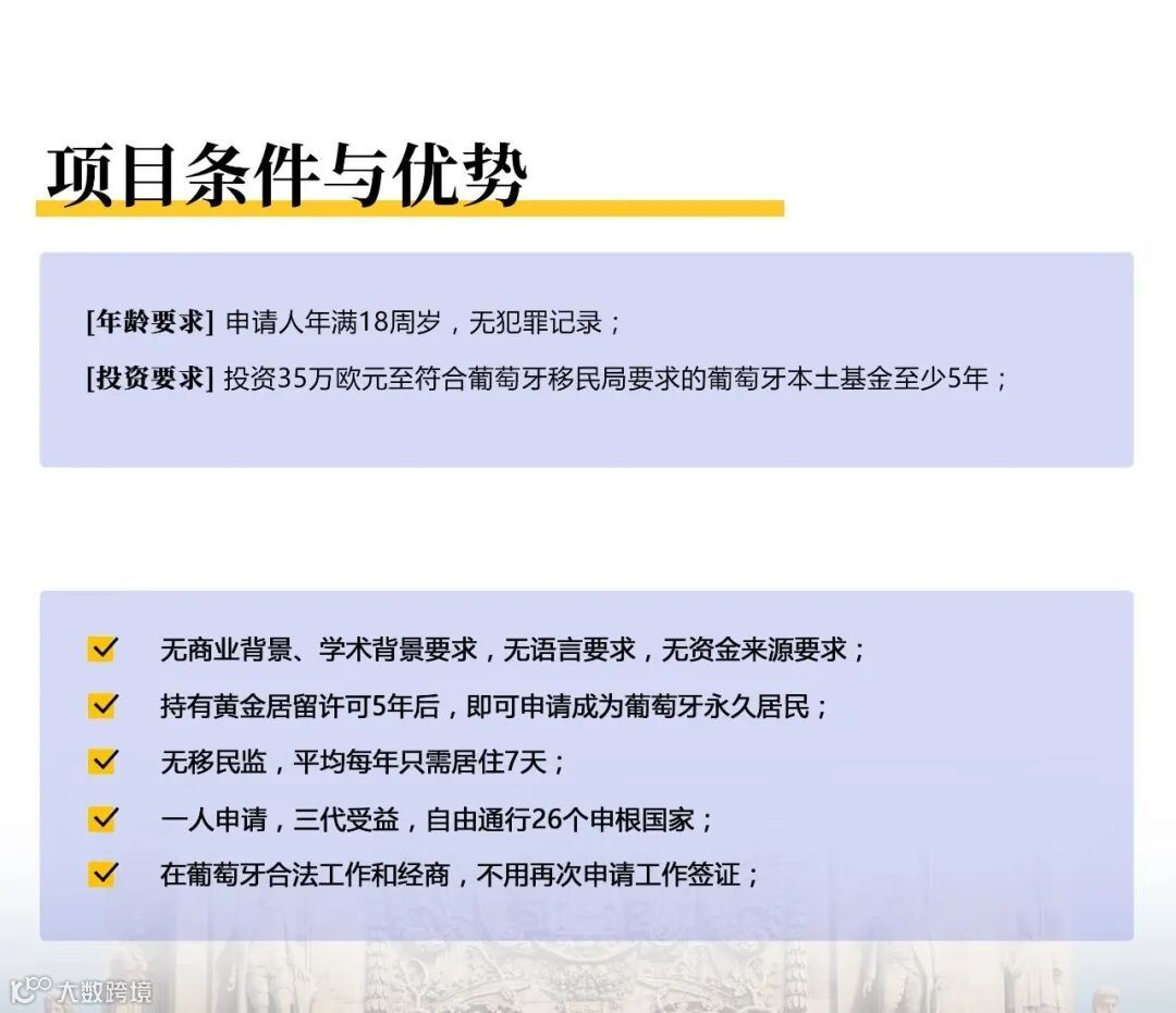 葡萄牙黄金签证中最受申请人喜爱的就是“购房移民”,仅需购买一套符合条件的葡萄牙房产,即可满足申请条件。