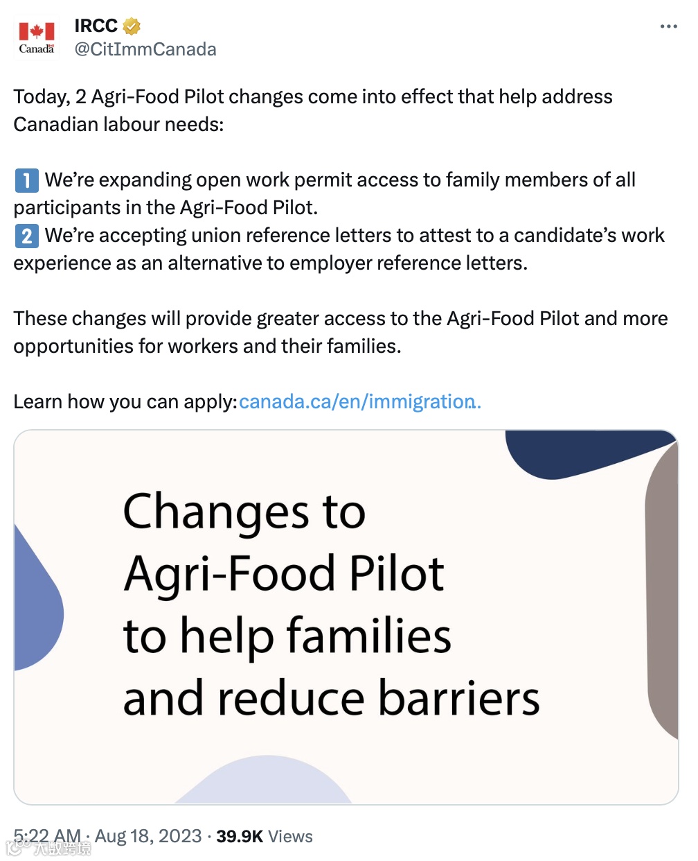 加拿大当前对劳动力的需求不言而喻,放开各类型的工签申请限制也在情理之中。作为世界前五的农业食品和海产品出口大国,农业食品系统在加拿大提供了九分之一的就业机会。