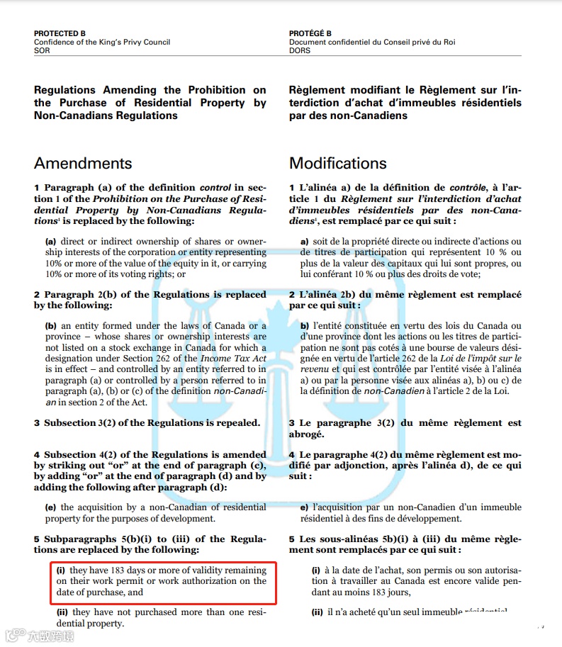 修正案将允许持有工作许可证或根据移民和难民保护条例获授权在加拿大工作的人购买住宅物业。如果持有人的工作许可证在购买时还有183天或以上的有效期,并且他们没有购买超过一套住宅物业,就有资格买房。废除有关税务申报和在加拿大工作经验的规定。
