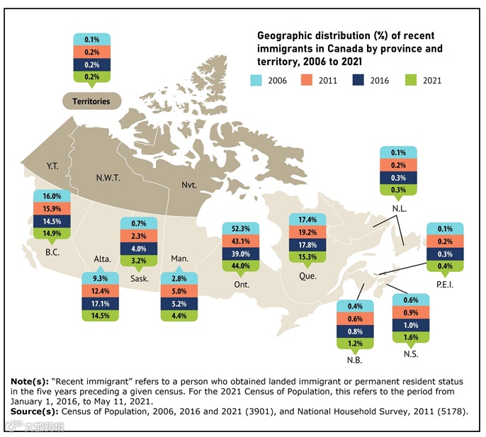 2016年,有56%的新移民选择居住在这三个城市。到了2021年,这一数据下降为53.4%。