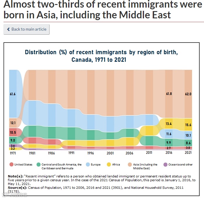 近些年,来自亚洲的新移民从1971年的12.1%上升到2021年的62%。