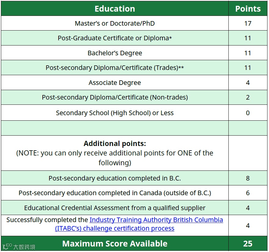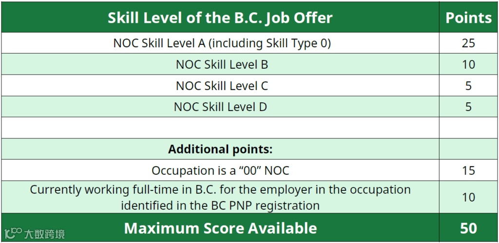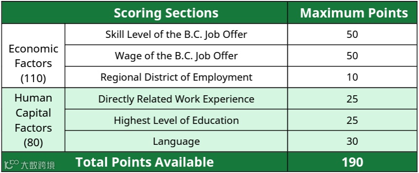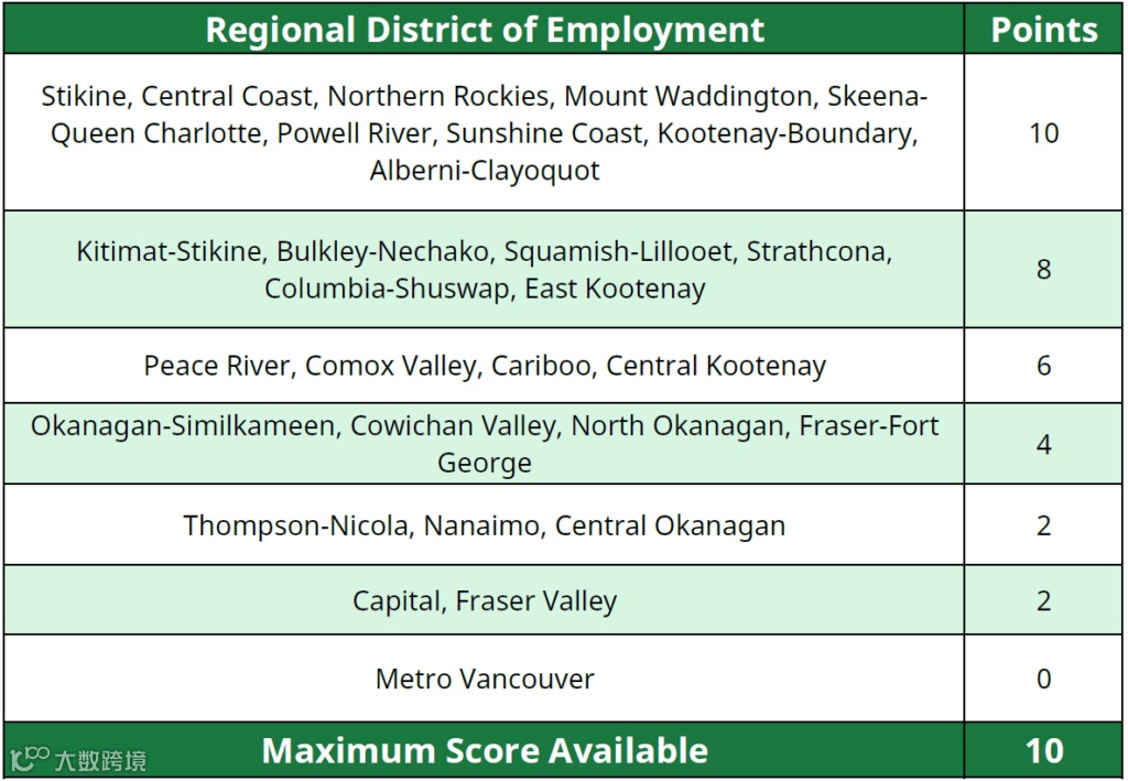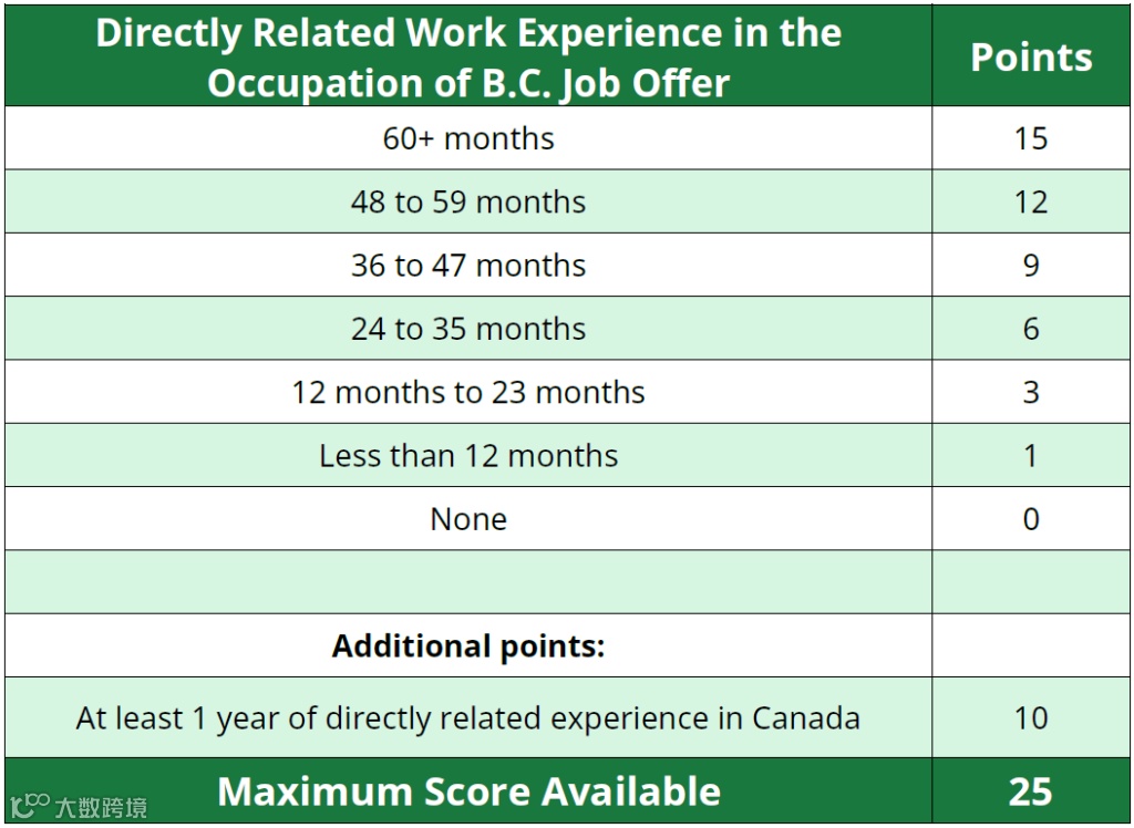“目前在BC省为雇主全职工作”加分项分数保持不变,仍为10分,但是由“工资评分项”移到“直接相关工作经验项”