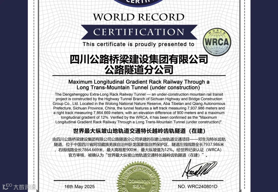喜报!我所在的都四轨道DSZH标三分部邓生沟隧道成功斩获世界纪录啦!
