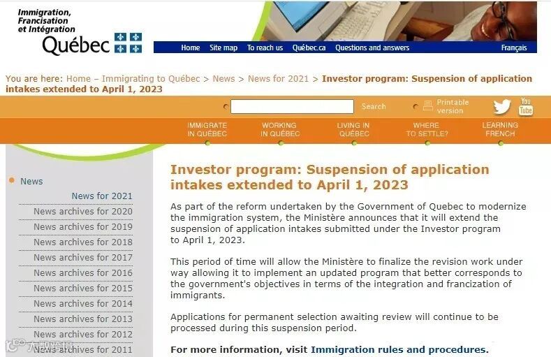 去年4月,魁北克政府宣布,原本应该于4月1日重新开放的投资移民项目将会继续暂停至2023年4月1日。