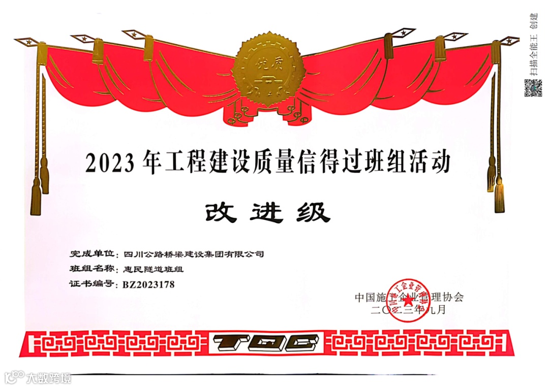 项目在标准化班组建设、平安工地考核等方面均位列元绿高速项目前茅,近三年信用评价考核多次评为AA,并获得四川省质量与监理协会及中国施工企业管理协会“信得过班组”荣誉称号。