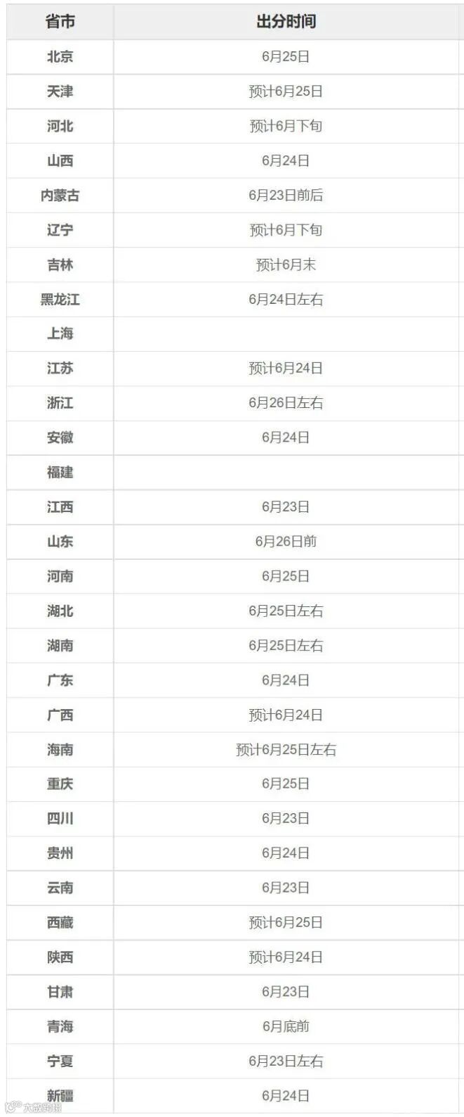 此外,山西、江苏、安徽、广西、陕西等地将放榜时间定于6月24日左右,北京、天津、河南、湖北、湖南、广东、海南、重庆、西藏等地定于6月25日左右,浙江、山东等地则定于6月26日左右。