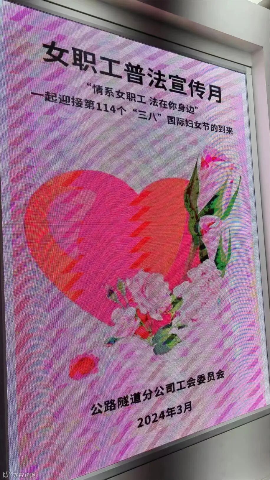 为持续深化四川省总工会“情系女职工 法在你身边”女职工权益保护普法宣传进基层活动,三月,公路隧道分公司工会围绕女职工普法宣传月主题,通过发布主题海报、悬挂宣传标语、设置咨询服务台、发放宣传手册和“女职工维权行动月”纪念章、开展有奖知识竞答等举措,营造全面维护女职工权益的良好氛围。