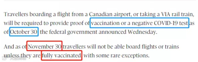 加拿大政府公布新的出行规定,从10月30日开始,乘火车、飞机必须需出示完全接种疫苗证件或检测阴性证明中的其一!