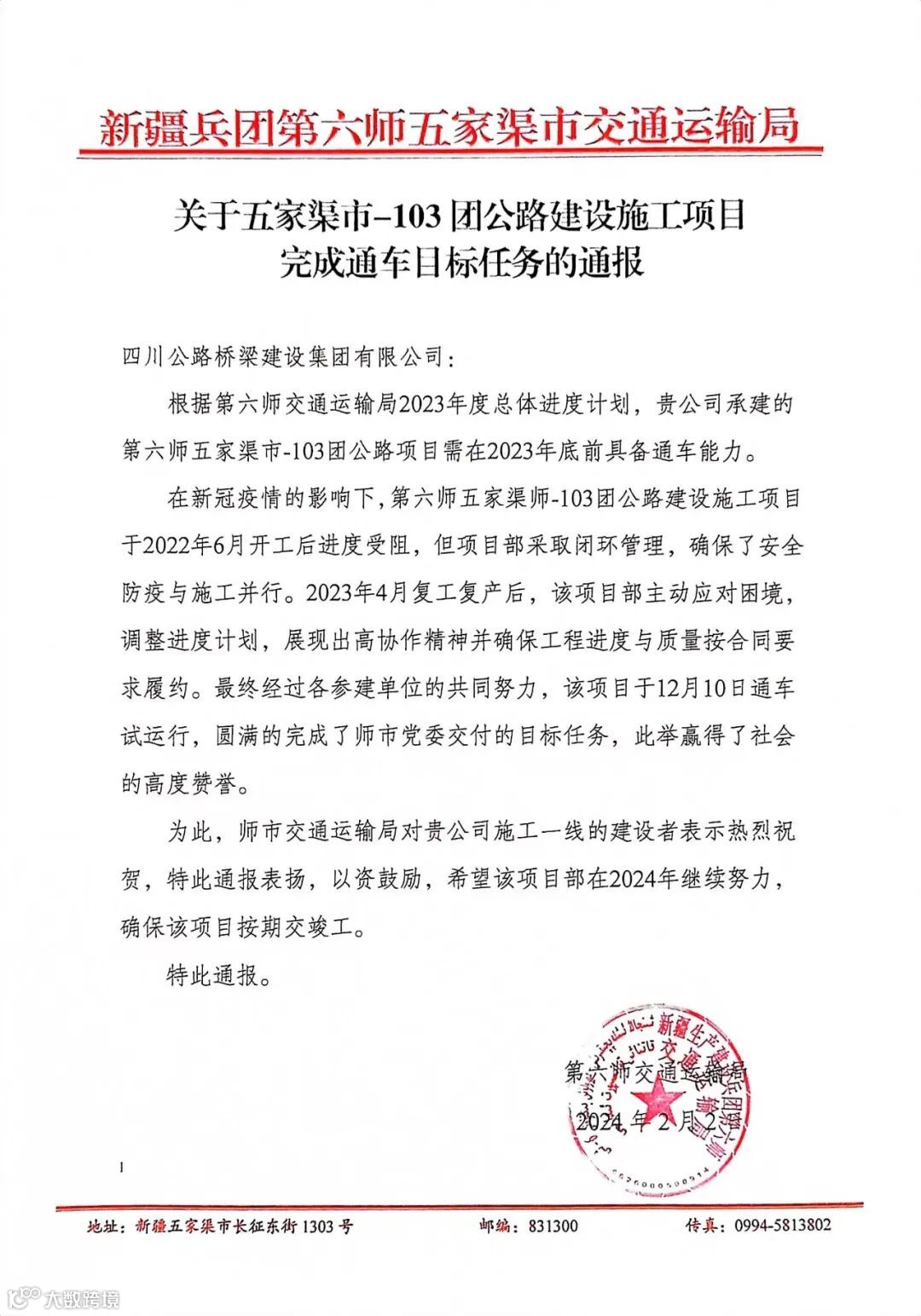 为此,师市交通运输局特此通报表扬,四川公路桥梁建设集团有限公司公路隧道分公司第六师五家渠市-103团公路项目作为承建单位,在项目实施过程中展现出了高效的管理和施工能力,确保了工程按期完成。并希望项目部在未来的工作中继续保持优异表现,再接再厉、奋勇拼搏,确保项目按期交竣工。