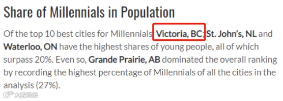 千禧一代人口比率排名中,BC省会维多利亚市排名第一。