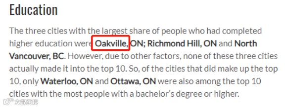 教育方面,安省奥克维尔市,拥有最多接受过高等教育的人口。