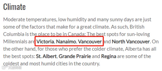气候方面,西岸的维多利亚市,纳奈莫,温哥华位居前三。