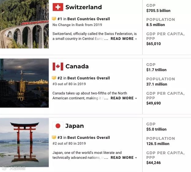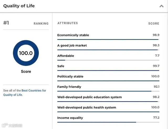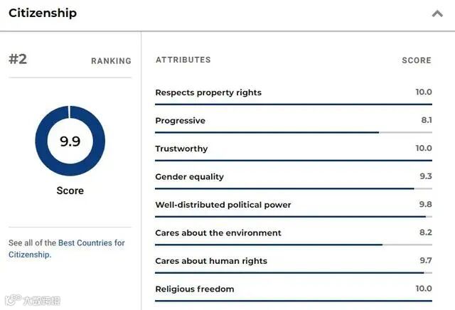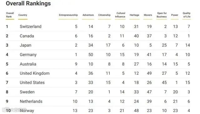 第一则是以10/10的成绩第四年连续蝉联世界最佳国家榜首的瑞士。