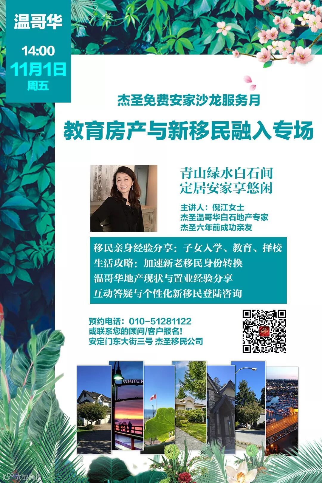 11月1日,杰圣免费安家服务月第二场开讲:杰圣成功亲友、温哥华地产专家倪江女士,与您聊聊新移民教育生活与温哥华白石地产!