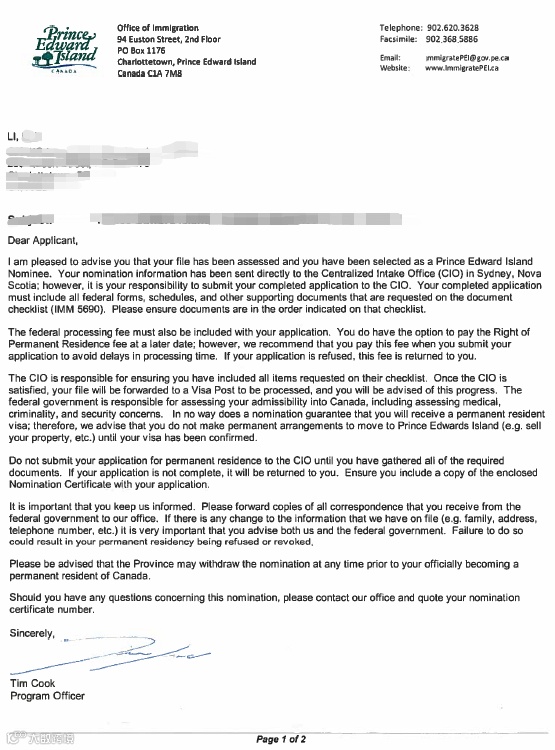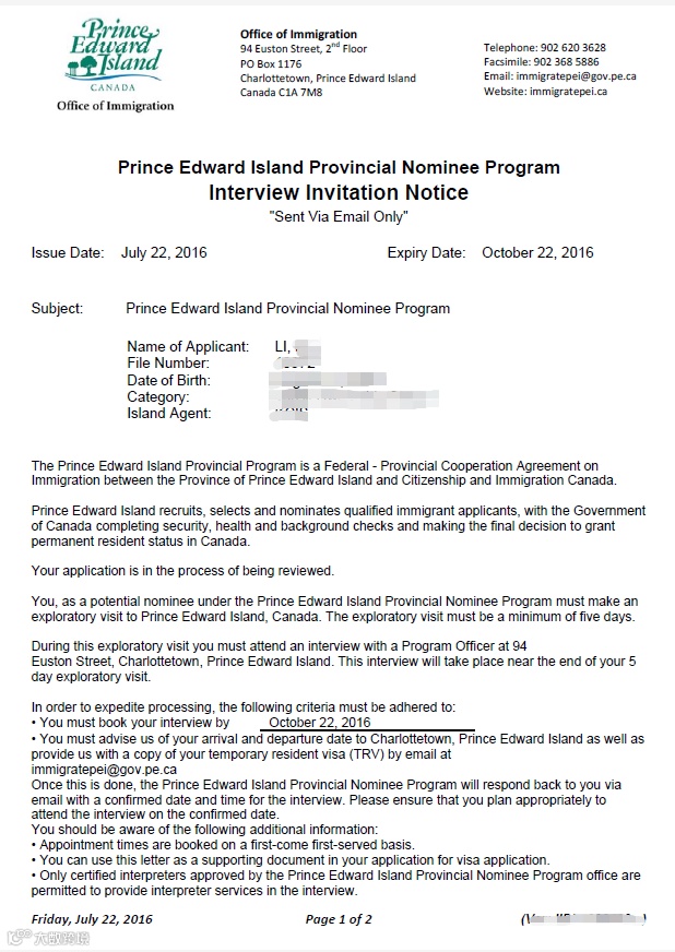 2016年11月,收到省移民面试邀请函,并在12月份完成通过。