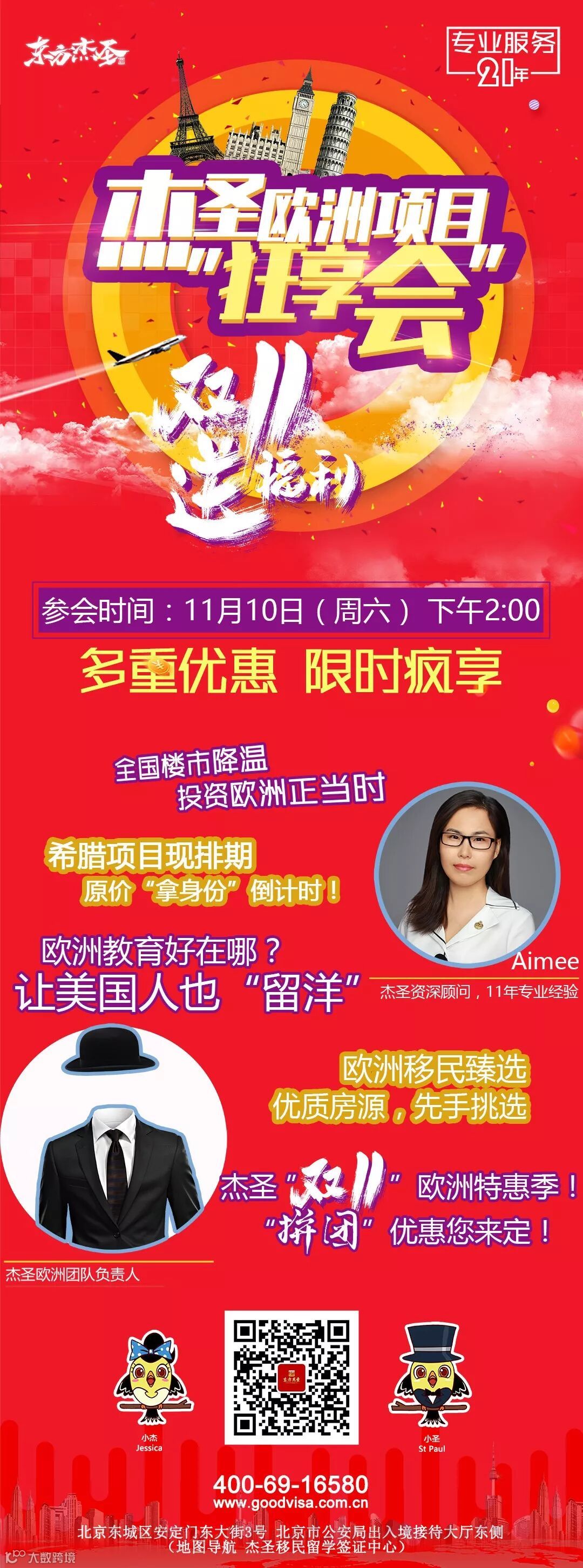 更多有关欧洲项目精彩内容,尽在11月10日(周六)下午14:00【杰圣欧洲项目狂享会】,届时将由杰圣资深移民顾问、杰圣欧洲项目团队负责人为大家带来有关欧洲项目最全攻略详解,还有最新增值房源,以及“惠上加惠”福利活动!限时狂享,敬请期待!