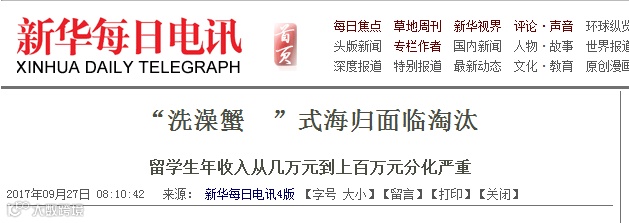 “新华视点”记者采访发现,把留学当“镀金”轻松溜一圈回国的“洗澡蟹”式海归,在激烈的竞争中面临淘汰,留学生年收入从几万元到超过百万元分化严重。
