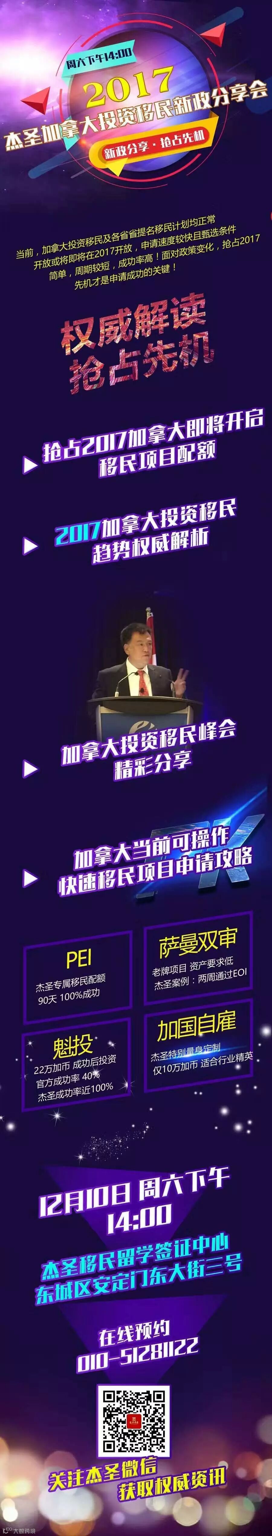 齐立新先生在本次峰会中,分别和加拿大两任移民部长、各省移民官及加拿大知名大律师进行了友好会谈。同时,我们将在本周六(12月10日)下午两点举办杰圣加拿大投资移民专场讲座,届时,我们将发布2017最新加拿大移民政策趋势分享以及本次加拿大投资移民峰会的交流结果,敬请期待!预约:010-51281122